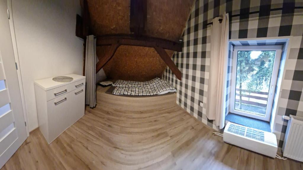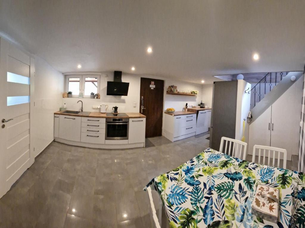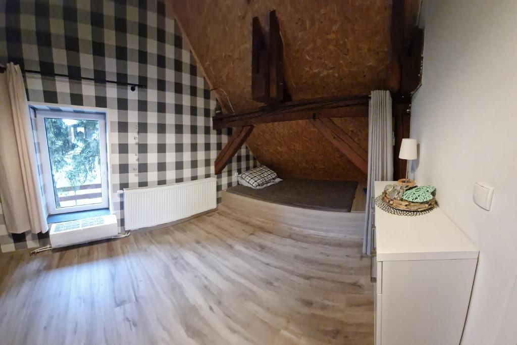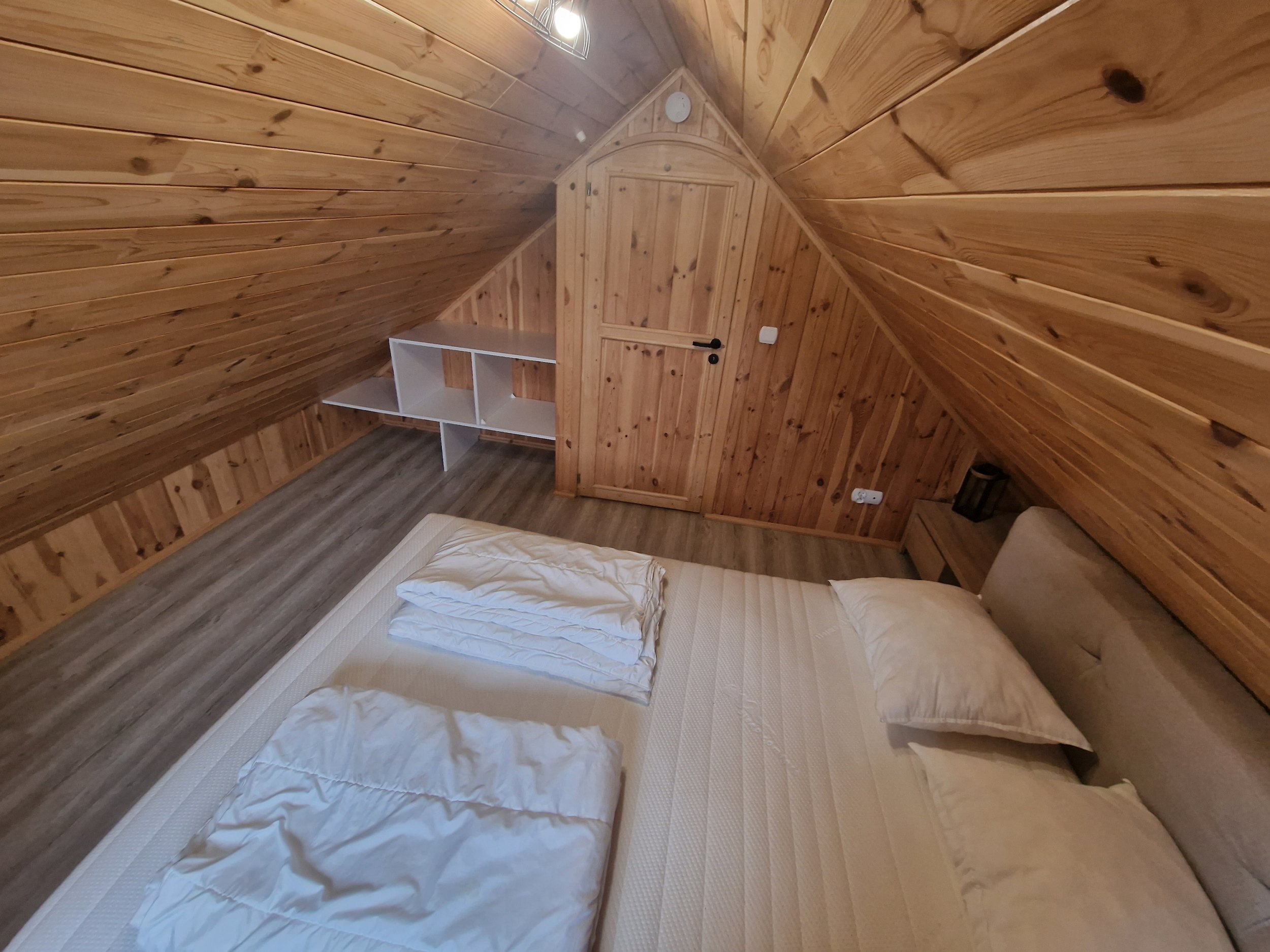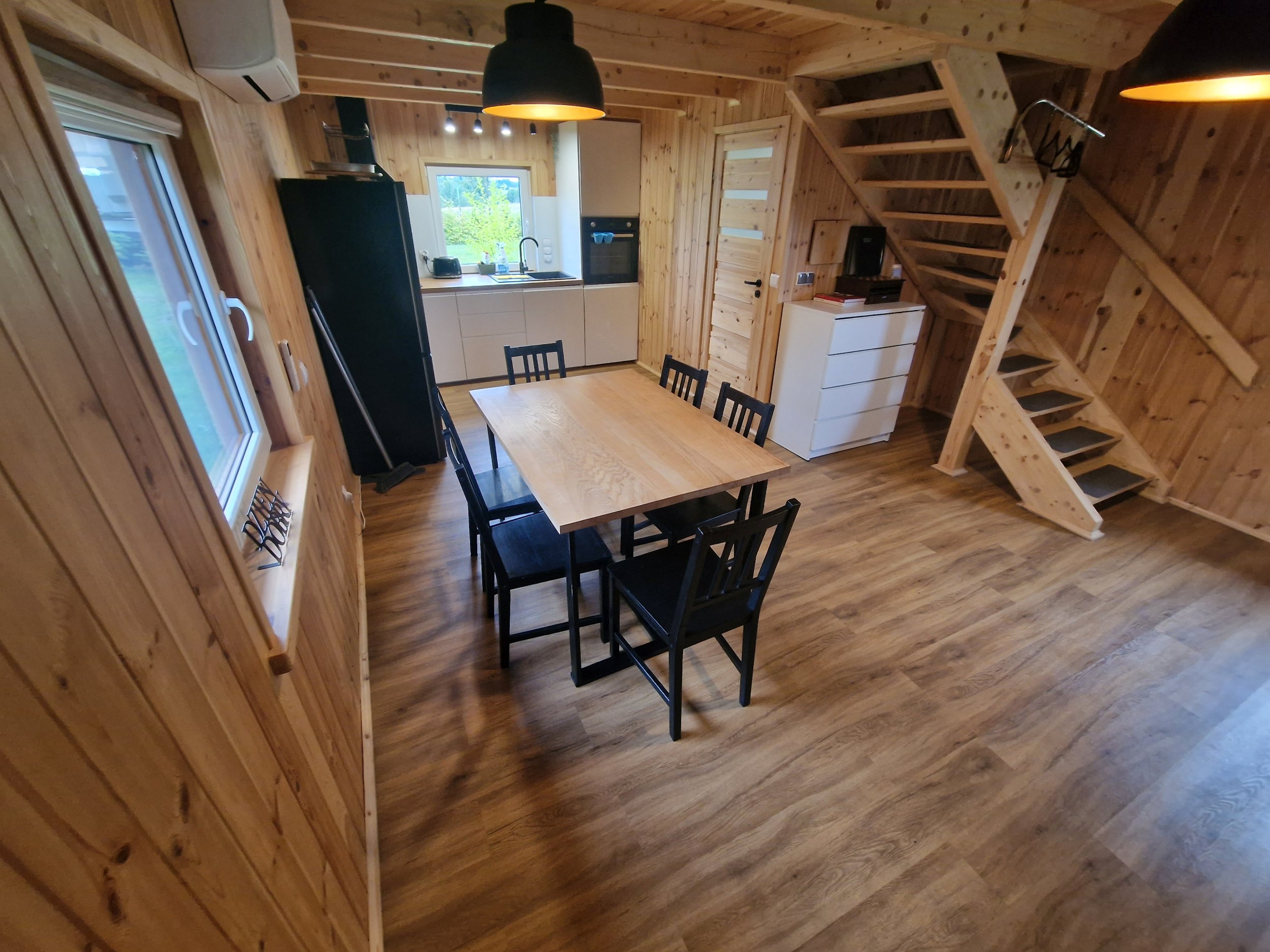 Salon, jadalnia , kuchnia 35m2, jedno rozkładane łóżko podwójne Poddasze dwie sypialnie , w jednej podwójne łózko , druga dwa pojedyncze łózka .
